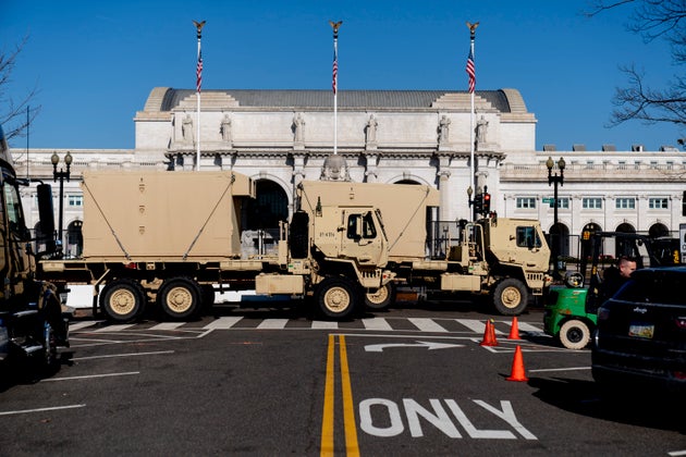 週四,在國會山聯合車站附近,軍用卡車駐紮在周邊圍欄後面。